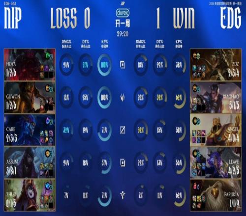 第一局前期Xiaohao赵信三度抓下连续逮捕Assum厄斐琉斯,NIP三人上路越掉Zdz鳄鱼,Xiaohao赵信再度中上gank得手,12分钟EDG经济优势约5k。