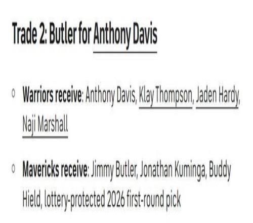 勇士得到:浓眉+克莱+哈迪+马绍尔;