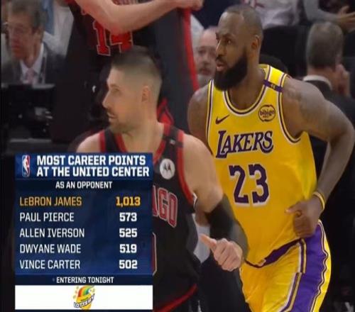 詹姆斯在末节比赛打破得分荒,但进攻威力依然伴随体能下滑减弱。所幸,湖人还是挡住公牛反扑拿下胜利,詹姆斯也成为NBA历史首位在芝加哥联合中心,作为对手轰下超过1000分的球员,而排名第二的皮尔斯是573分,距离詹姆斯的纪录相差甚远。