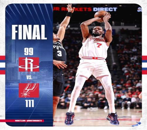 申京、阿门相继强攻内线未果,文班亚马2罚全中,距离终场不足52秒,乌度卡换上板凳席末端的球员,选择提前认输,比赛就此失去了悬念。卡佩拉2罚1中,随后完成扣篮,最终,马刺以111比99力擒火箭,上演了16分大逆转好戏。休斯顿单节以13比27落后,火箭末节投篮23投仅4中,三分2中0,惨遭翻盘。
