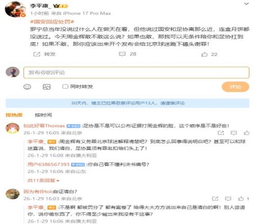 在北京国安删帖之后,李平康表示,“说实话,国安球迷应该很希望俱乐部能出来正面地解释一下到底是怎么回事!说实话吧,今天的处罚,不能接受的只有国安,在中国足球这个环境中,对大多数球队这都无所谓的,主要别人也被罚,自己罚的少还是赚了。但国安不是,这些年冠军没怎么拿到,骄傲的就是清白身,连清白都没了,国安也没了!”