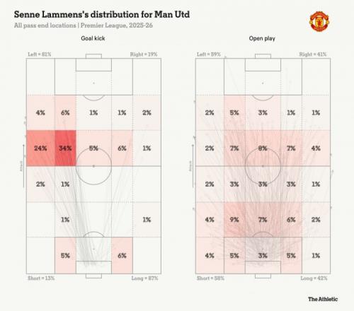 这与上赛季奥纳纳的踢法形成了鲜明对比:奥纳纳的球门球仅有65%为长传,而拉门斯的这一比例高达87%,运动战中的选择亦是如此。