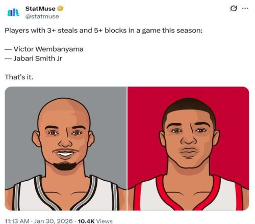 其中小贾巴里史密斯尤为明显,全场小贾打出攻防俱佳表现,12中5,三分6中2拿下14分8板3助3断5帽全能表现,正负值+15首发第一名,也让其成为本赛季文班之后,第二位单场送出至少3断5帽的球员。