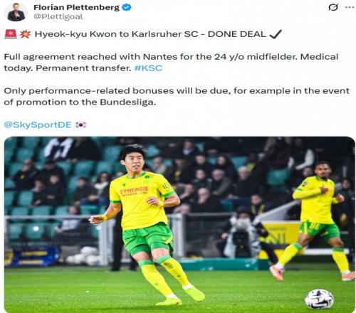 报道称卡尔斯鲁厄与南特就这名24岁的中场球员转会达成了全面协议。球员将在今日体检,永久加盟卡尔斯鲁厄。卡尔斯鲁厄只有在特定情况下,例如球队升入德甲时,才会支付与表现相关的奖金。