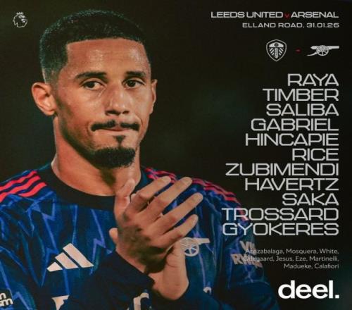 英超第24轮,阿森纳客战利兹联,赛前阿森纳首发阵容出炉,具体名单如下: 阿森纳首发:拉亚 / 廷伯、萨利巴、加布里埃尔、因卡皮耶 / 赖斯、苏维门迪、哈弗茨 / 萨卡、哲凯赖什、特罗萨尔