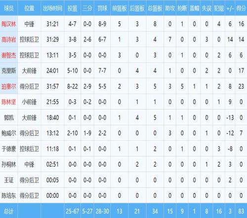 本场比赛,山东队共4人分上双,珀塞尔23分5篮板3助攻5抢断,陶汉林16分8篮板,克里斯17分4篮板,高诗岩14分4篮板7助攻。近期表现不俗的小将王证仅获得5秒上场时间。此外,两名小外援本场手感冰冷,合计32投10中,砸歪篮筐。