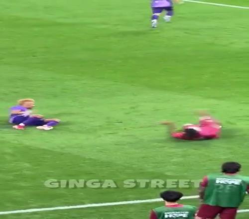 两名球员在球场边突然上演摔跤比赛,双方更是使出WWE摔跤动作,只见一方用“夺命剪刀脚”撂倒另一方,最后更是有球员上来扮演裁判为他们拍地板读秒!