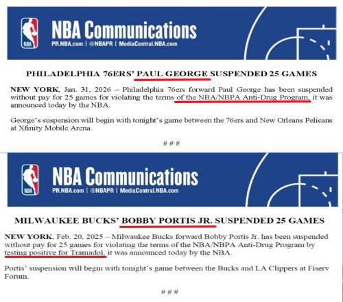 2024-25赛季中期,雄鹿队前锋波蒂斯同样因为错误服用药物而被禁赛25场。NBA在官方声明中称,波蒂斯在药检中被检测出曲马多阳性(一种阿片类药物 ,属作用于中枢的镇痛药,可缓解普通到严重的疼痛)。